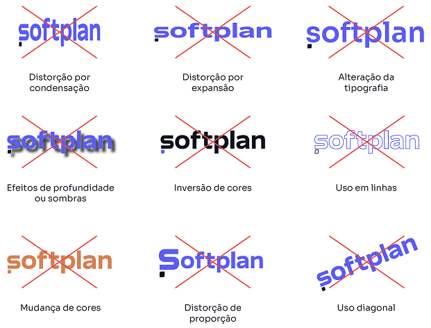 Exemplos de utilizações incorretas da marca, destacando os principais erros que podem ocorrer. Abaixo é possível verificar a versão correta para comparação.
