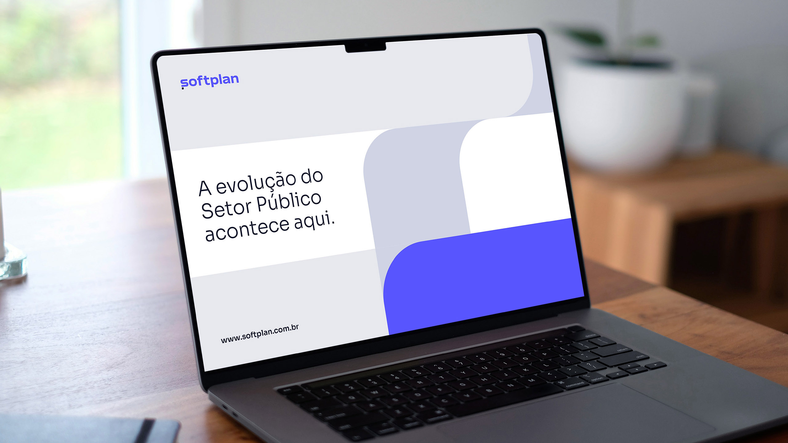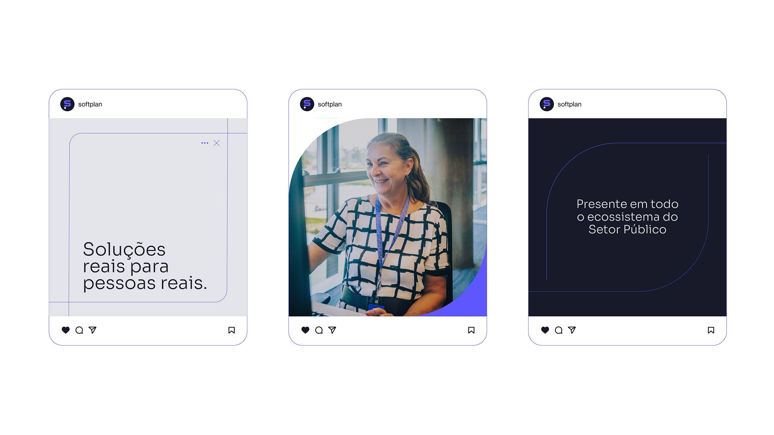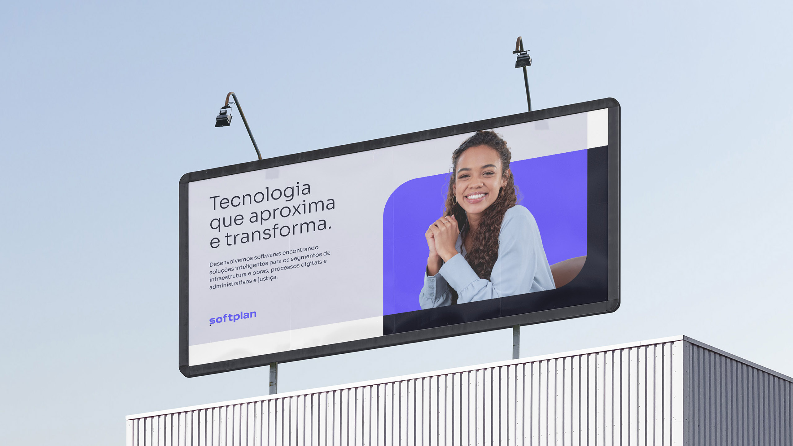 A identidade da Softplan é marcada pela paleta cromática sóbria, com predominância de diversas tonalidades de cinza. Em contraste, aplica-se pontualmente o Roxo principal da marca em pontos de destaque.